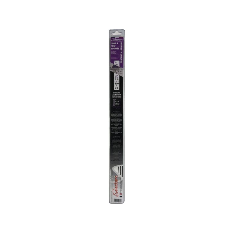 Alliage de zinc-aluminium offrant une technologie tubulaire. Conçu pour le brasage des Aluminium sans magnésium avec d'autres métaux type (Cuivre- Aciers Aluminium). Applications: échangeur de chaleur, climatisation, système climatisation automobile, radiateurs, . Ø : 2 mm Longueur : 500 mm Quantité par blister : 3 baguettes