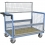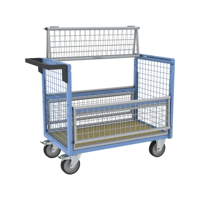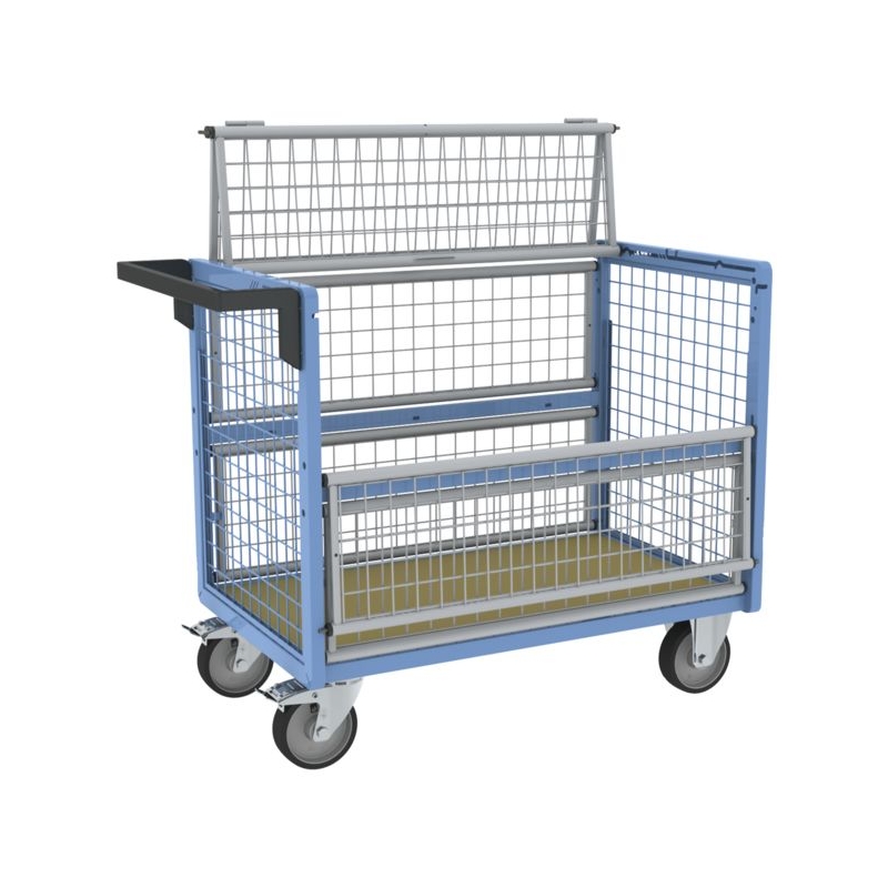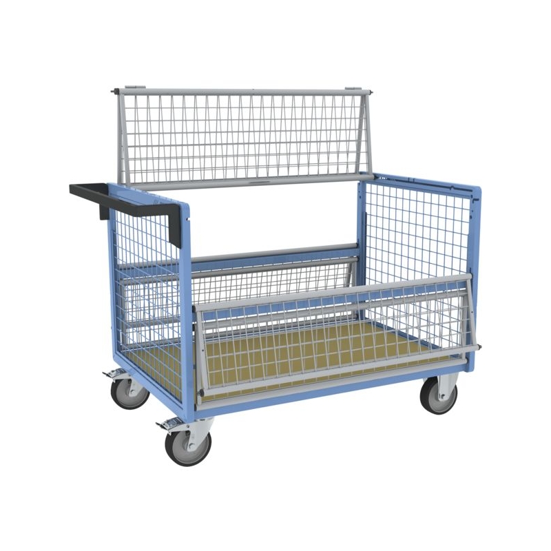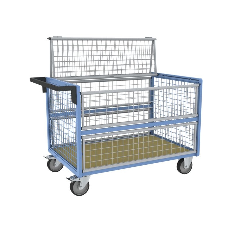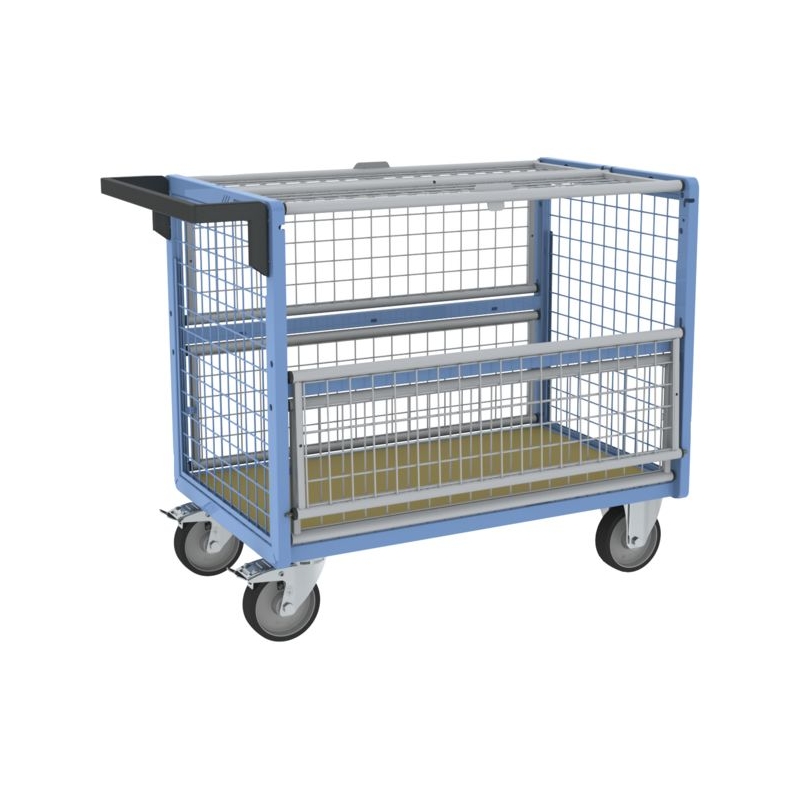 Idéal pour la collecte, la manutention et le stockage des marchandises. Habillage grillagé (maille 50 x 50 mm) et plateau intérieur en bois medium épaisseur 16 mm. Roues à bandage TPE Ø 160 mm, 2 fixes et 2 pivotantes à frein. Capacité de charge : 500 kg Dim. utiles : L 960 x l 555 x H 680 mm Dim. hors tout: L 1160 x l 635 x H 955 mm Poids : 48 kg
