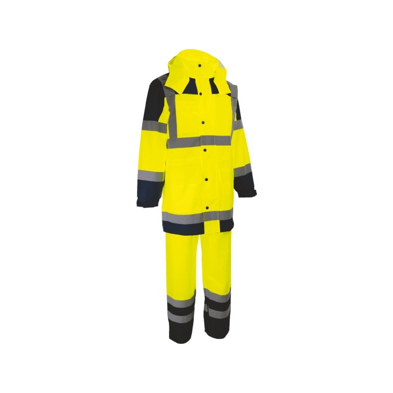100% polyester Oxford 300D enduit PU. Veste : Bandes rétroréfléchissantes 2 horizontales, 2 brassards et bretelles, coutures étanchées, doublure filet, 2 poches basses, 1 poche poitrine téléphone. Capuche fixe enroulée dans le col avec vision latérale, fermeture centrale à glissière sous rabat pressions, poignets réglables. Pantalon : 2 bandes rétroréfléchissantes, serrage élastique à la taille, braguette. Coloris : jaune fluo/bleu marine, orange fluo/bleu marine Tailles : M à 3XL Norme : CE Cat II - EN ISO 20471 (3) pour la veste - EN ISO 20471 (1) pour le pantalon - EN 343 (3.1)
