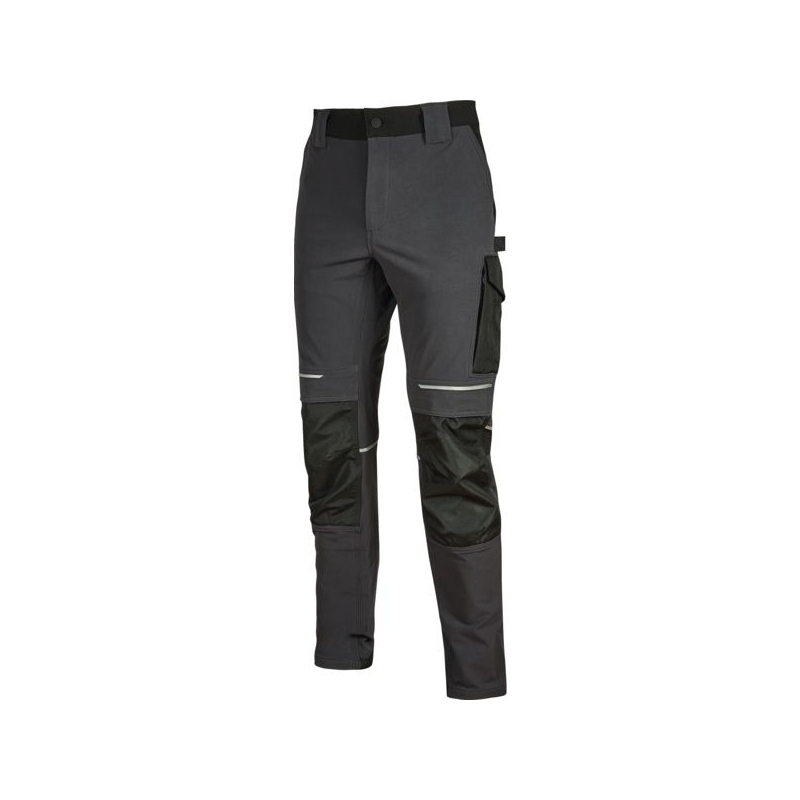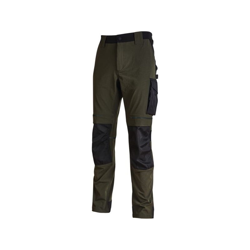 90% nylon 10% spandex, 260 gr/m2. Tissu stretch, doux au toucher, déperlant, respirant et au séchage rapide. Poche latérale porte-outils, poche latérale multifonction avec porte badge rétractable, 2 amples poches à l?arrière, 2 poches porte-genouillère à ouverture facile par le haut (réf 103541 à commander séparément), poches zippées cachées sous la grande poche latérale et sous la poche avant droite. Bas de pantalon entièrement renforcé en polyoxford 600D. Bavette à l?arrière pour une meilleure protection lombaire. Taille élastiquée avec un système innovant de serrage invisible. Coloris : noir/jaune, marine/orange Taille : M à 2XL