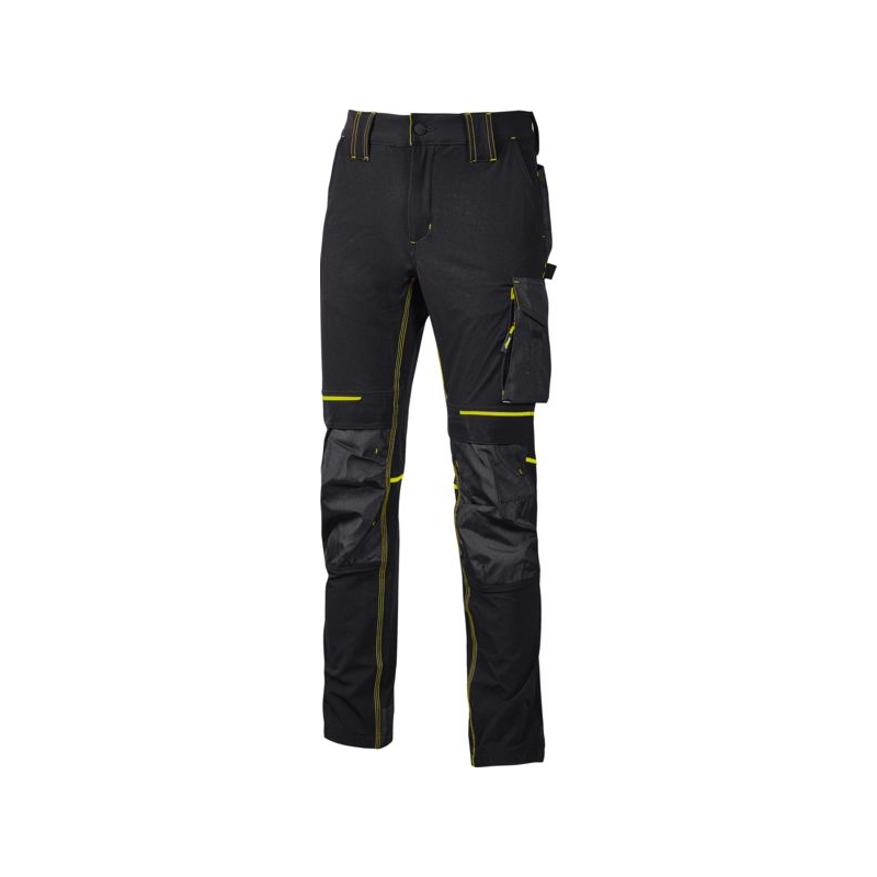 90% nylon, 10% spandex, 260 g/m². Tissu stretch, doux au toucher, déperlant, respirant, séchage rapide. Taille élastiquée, bavette à l'arrière pour une meilleure protection lombaire. Poches latérales porte-outils, multifonction avec porte badge rétractable, 2 poches arrières, poches zippées sous une grande poche latérale. Emplacements pour genouillères réf. 103541 (à commander séparément). Bas de pantalon entièrement renforcé en polyoxford 600D. Coloris : noir/jaune, marine/orange Taille : M à 3XL Norme : CE Cat II - EN 14404 (si porté avec les genouillères)