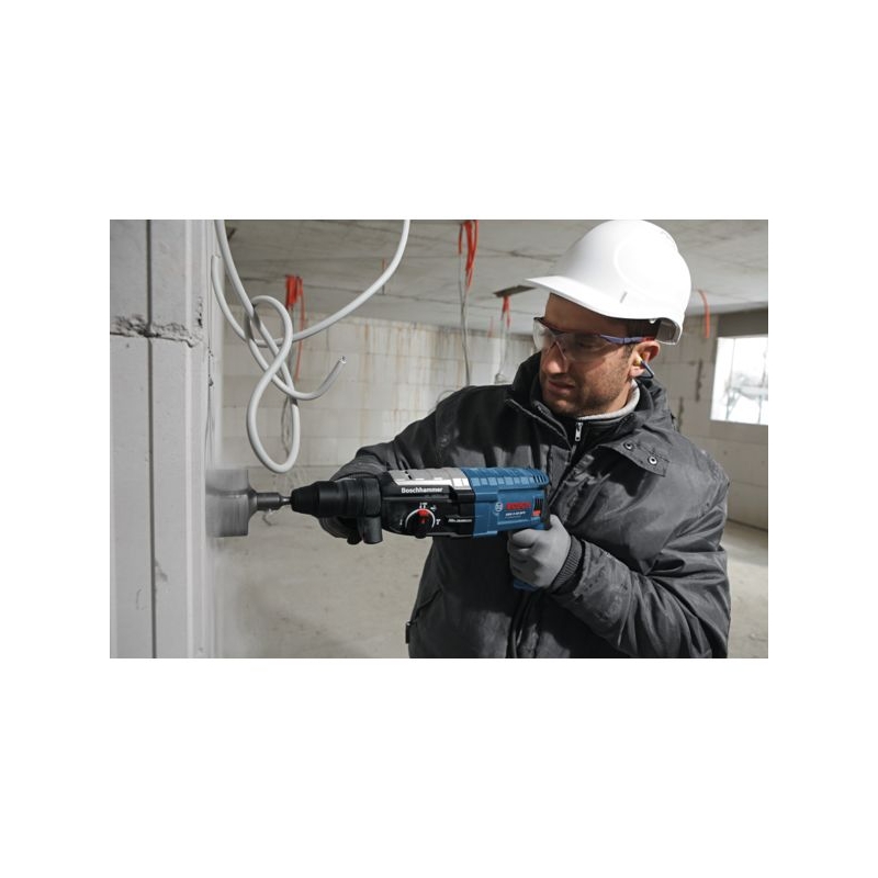 Compact et robuste avec carter métal. Gestion électronique de la vitesse. Orientation de l'outil. Embrayage de sécurité. Stop de rotation. Stop de frappe. Mandrin interchangeable. Emmanchement : SDS-Plus Puissance : 880 W Puissance de frappe : 3,2 J Vitesse : 900 tr/mn Cadence de frappe : 4000 cps/mn Capacité de perçage : béton 28 mm Taux de vibrations : 11 m/s² Poids : 3,100 kg Livré en coffret avec mandrin interchangeable autoserrant, mandrin SDS-Plus, jauge de profondeur.