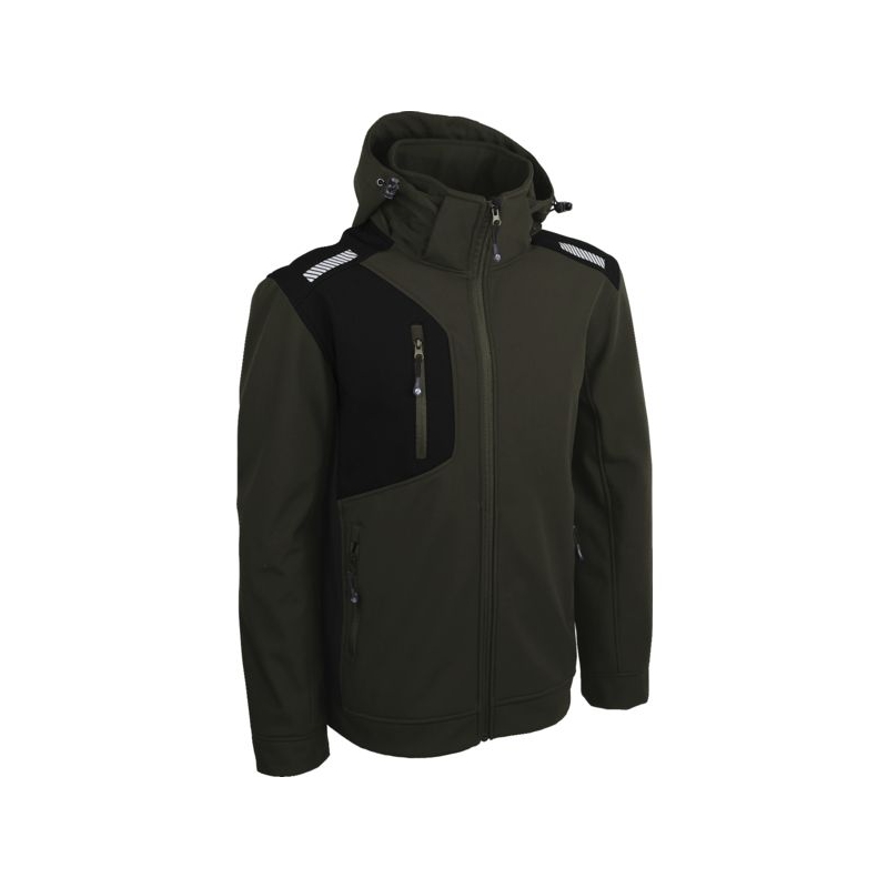 Softshell, 94% polyester 6% élasthanne, Ripstop, enduction TPU, 300 g/m². Tissu avec membrane, imperméable, respirant et coupe-vent. Doublure intérieure en micropolaire. Fermeture centrale à glissière, capuche réglable amovible, poignets bord côte. 3 poches sur le devant avec fermeture à glissière. Inserts rétroréfléchissants sur les épaules. Coloris : noir, marine, bronze Tailles : M à 4XL